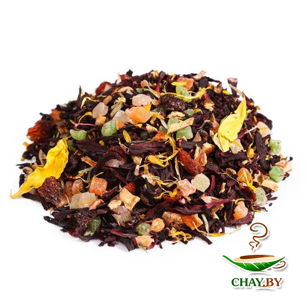 цукаты тропических фруктов, лепестки гибискуса, кожура шиповника, виноград, цедра апельсина