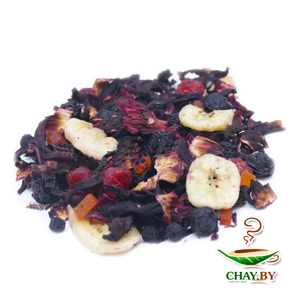 Фруктовый коктейль из лепестков суданской розы, черноплодной рябины, сушеных ягод черной и красной вишни, дополненный банановыми чипсами и кусочками ананаса.